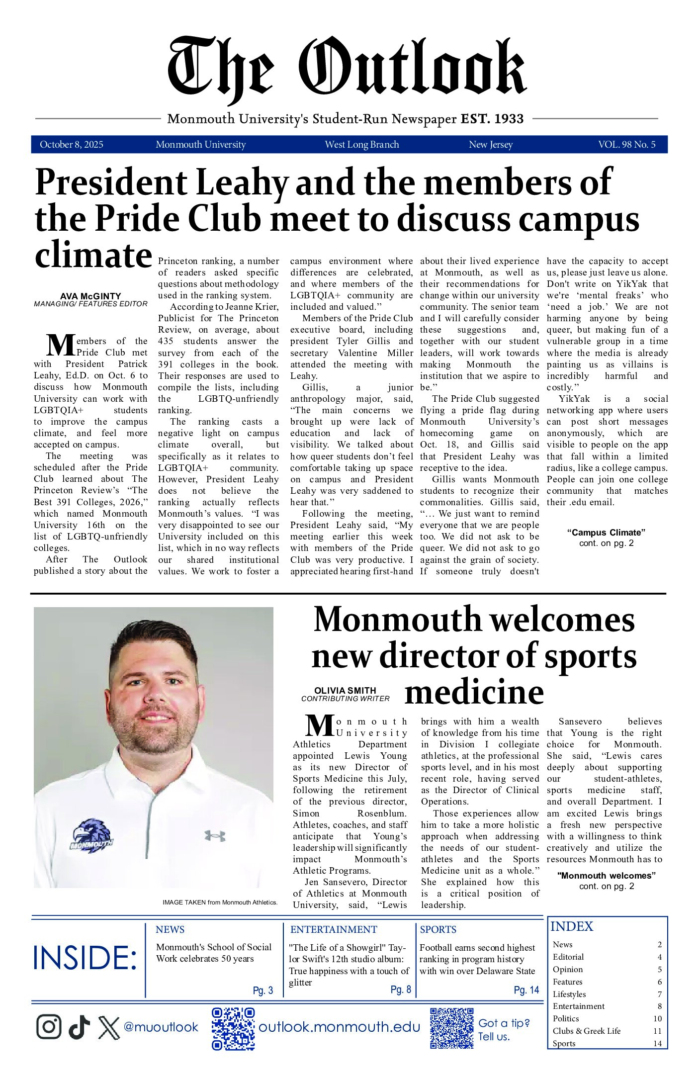Members of the Pride Club met with President Patrick Leahy, Ed.D. on Oct. 6 to discuss how Monmouth University can work with LGBTQIA+ students to improve the campus climate, and feel more accepted on campus. The meeting was scheduled after the Pride Club learned about The Princeton Review’s “The Best 391 Colleges, 2026,” which named […]